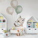 Les ballons pastel flottent gracieusement au-dessus du renard, tandis que des feuilles tropicales en arrière-plan apportent une ambiance apaisante et naturelle. Les teintes douces de beige et de vert créent un environnement serein et chaleureux, idéal pour le sommeil et le jeu.