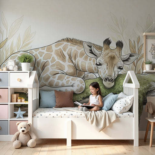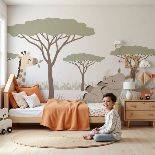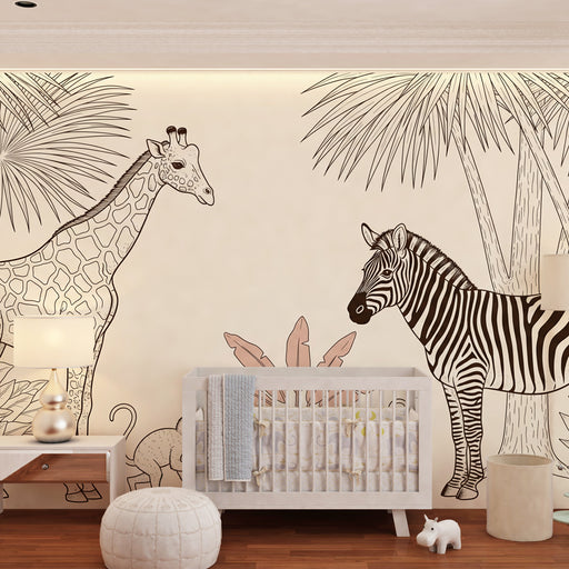 Réinventez la chambre de votre enfant en un véritable safari ludique avec ce papier peint pour chambre d enfant, orné de girafes adorables et de silhouettes d arbres. Le fond doux et pastel se marie parfaitement avec les motifs stylisés, apportant une touche de nature et d'exotisme à l'espace. Chaque girafe, au regard malicieux, invite à l'émerveillement et à l'imagination.