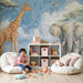 Plongez dans l'univers fascinant de la savane africaine avec notre papier peint safari, mettant en scène un majestueux éléphant, une élégante girafe, un lion imposant et divers oiseaux en vol. Ce design captivant est idéal pour apporter une touche d'exotisme et d'aventure à votre intérieur. Les teintes pastel créent une ambiance apaisante, parfaite pour une chambre d'enfant ou un espace de jeu.