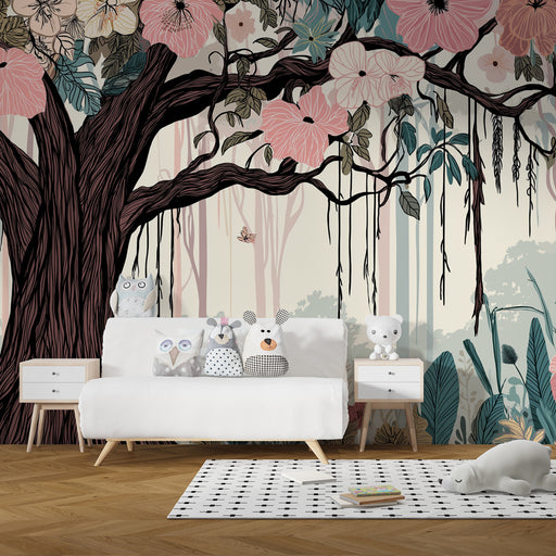 Papier peint chambre enfant | Arbre majestueux et fleurs colorées