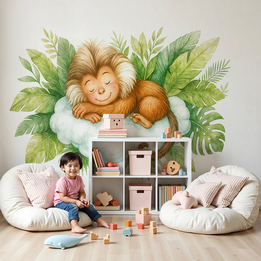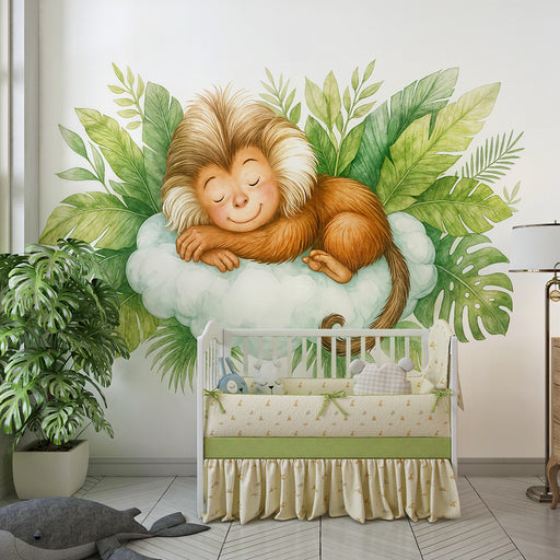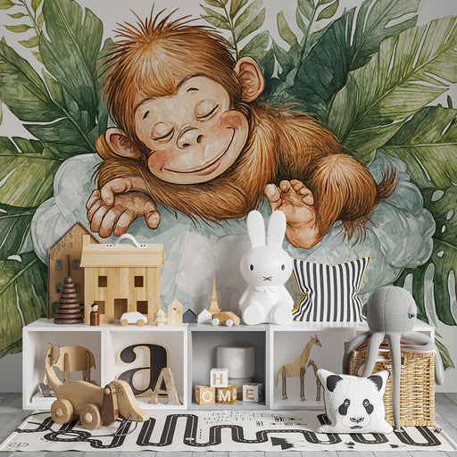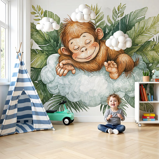 KidsWallCe papier peint singe rêveur présente un adorable singe endormi sur un nuage, entouré de feuilles de jungle. Idéal pour une chambre d'enfant, il ap...