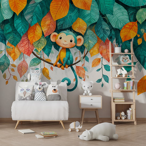 Papier peint chambre bébé | Singe espiègle et feuilles tombantes colorées