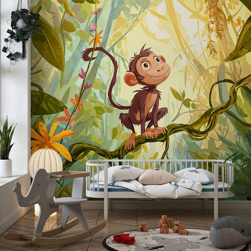 KidsWallCe papier peint singe animé apporte une touche de joie et d'aventure à toute pièce. La scène vibrante représente un petit singe curieux explorant u...
