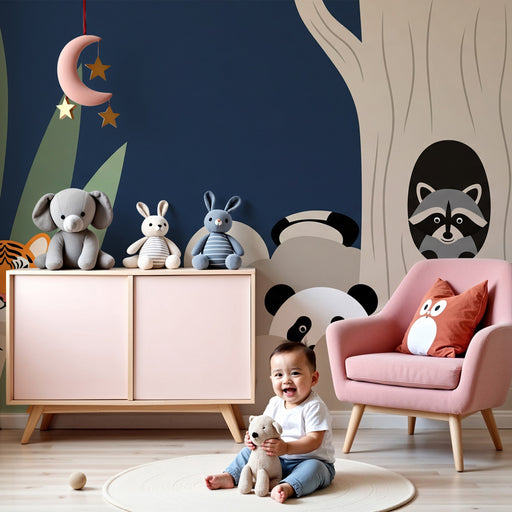 KidsWallApportez une touche de douceur et d'amusement dans la chambre de votre bébé avec ce papier peint original représentant un adorable raton laveur cac...