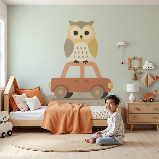 KidsWallAjoutez une touche ludique à la chambre de votre bébé avec ce papier peint pour bébé mettant en scène un hibou adorable perché sur une voiture colo...