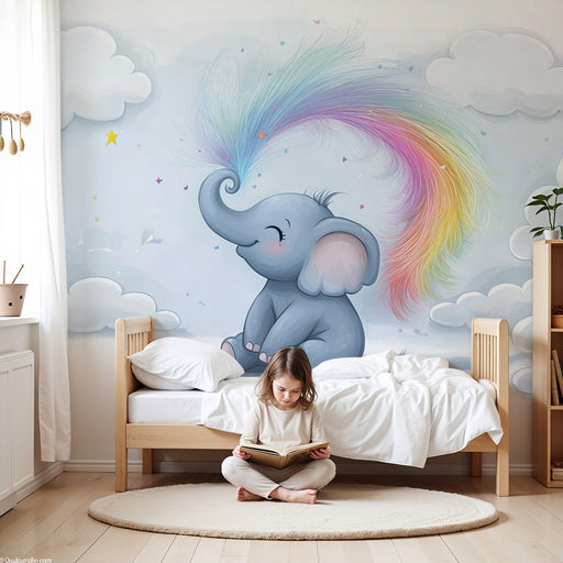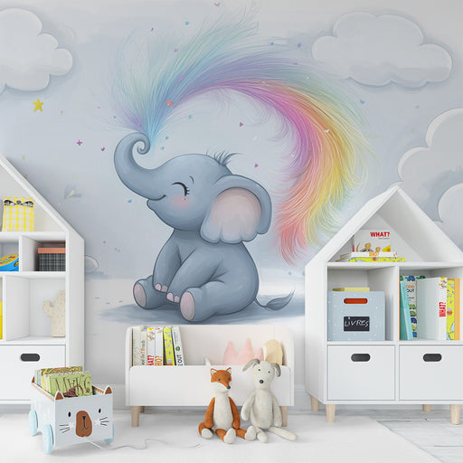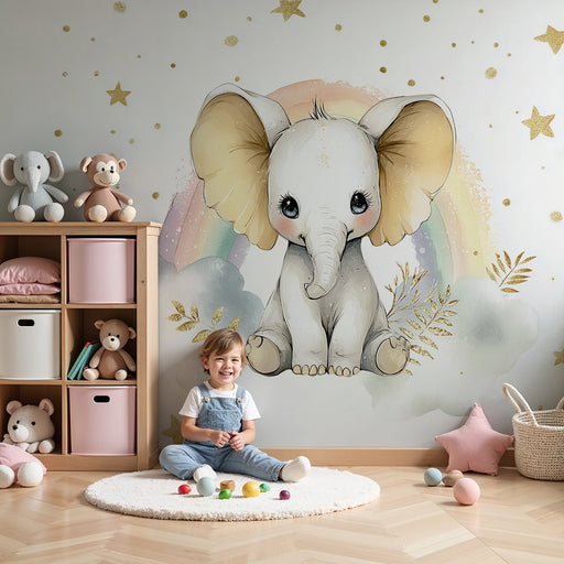 KidsWallTransformez la chambre de votre bébé avec notre papier peint éléphant élégant, mettant en scène un adorable éléphant entouré d'un arc-en-ciel paste...