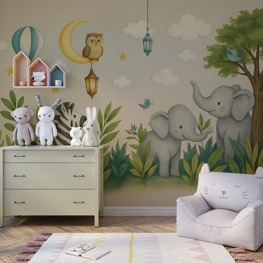KidsWallTransformez l'espace de votre bébé avec notre papier peint Safari enchanté, mettant en scène des éléphants amicaux, un zèbre curieux, et un hibou p...