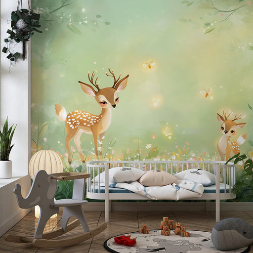 KidsWallCe papier peint enchanteur pour chambre d'enfant présente de doux faons entourés de papillons et de fleurs délicates dans une prairie verdoyante. I...