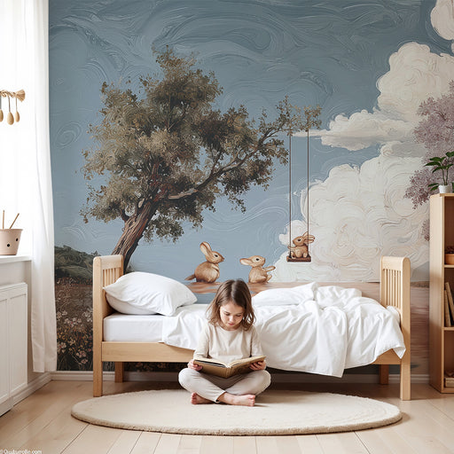 KidsWallDécouvrez notre papier peint lapins et balançoire, parfait pour créer une atmosphère douce et rêveuse dans la chambre de votre enfant. Ce motif enc...