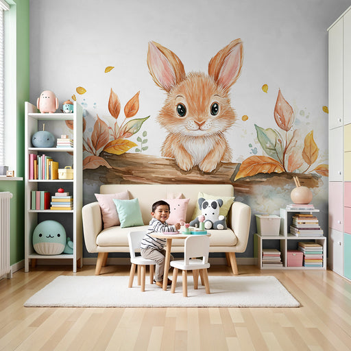 KidsWallApportez une touche de douceur automnale à la chambre de votre enfant avec notre papier peint lapin et feuilles d'automne. Ce design charmant prése...