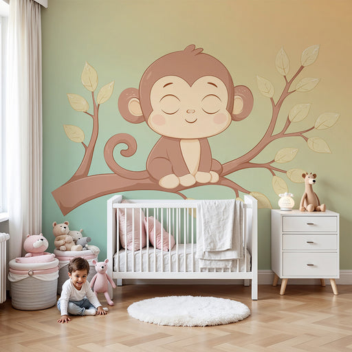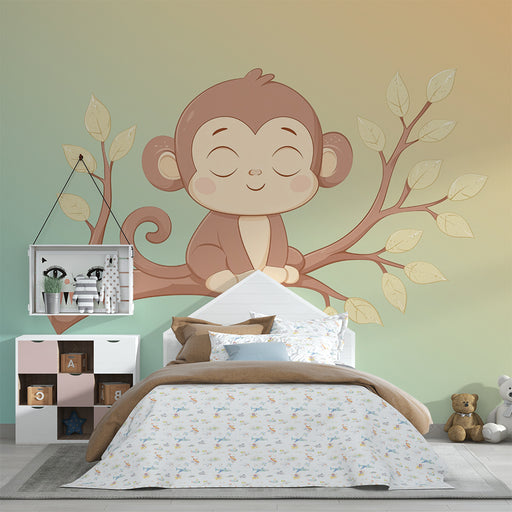 KidsWallCe papier peint adorable présente un petit singe paisible assis sur une branche, parfait pour la chambre d'un bébé. Les tons doux de l'arrière-plan...