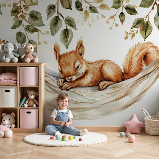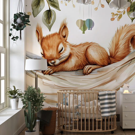 KidsWallOptez pour ce papier peint chambre bébé unique, mettant en scène un écureuil roux endormi dans un hamac tressé sous des branches feuillues. Ce desi...