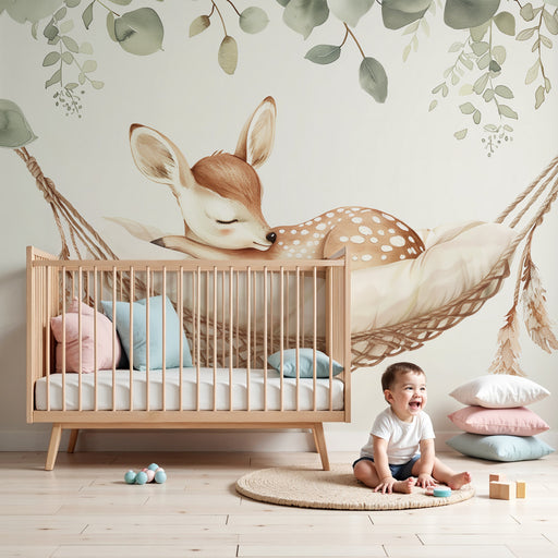 Afficher tous les détailsPapier peint chambre bébé | Faon endormi dans un hamac bohème sous les feuillages délicats