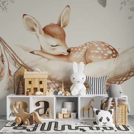 KidsWallTransformez la chambre de votre bébé en un havre de paix avec notre papier peint enchanteur. Ce design captivant met en scène un faon endormi dans ...