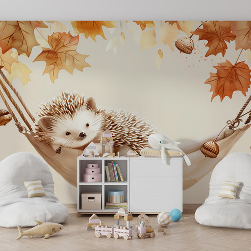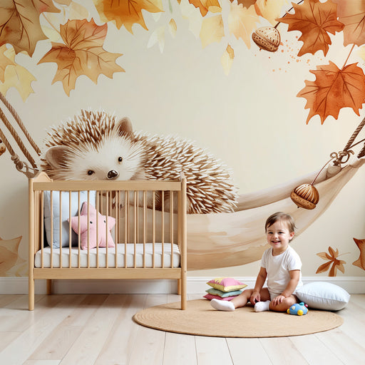 Afficher tous les détailsPapier peint chambre bébé | Hérisson câlin dans son hamac au milieu des feuilles d’automne et glands suspendus