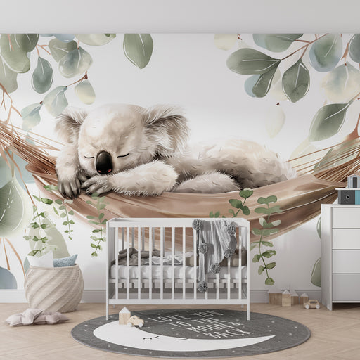 Afficher tous les détailsPapier peint chambre bébé | Koala endormi dans un hamac nature au cœur d’un feuillage d’eucalyptus