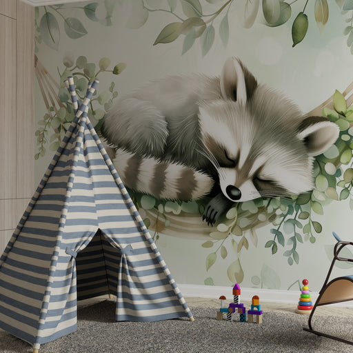 Afficher tous les détailsPapier peint chambre bébé | Raton-laveur blotti dans un hamac feuillu au cœur d’un écrin de verdure