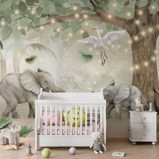 Afficher tous les détailsPapier peint chambre bébé | Éléphants joueurs sous la canopée lumineuse