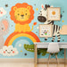 Faites entrer la joie et la magie dans la chambre de votre enfant avec ce papier peint pour enfants coloré. Au sommet d'un magnifique arc-en-ciel, un lion souriant trône fièrement, entouré de ses amis animaux : un éléphant espiègle, un zèbre amusant et un crocodile joyeux. Ce décor amusant crée un univers ludique et éveillera l'imagination de votre petit.