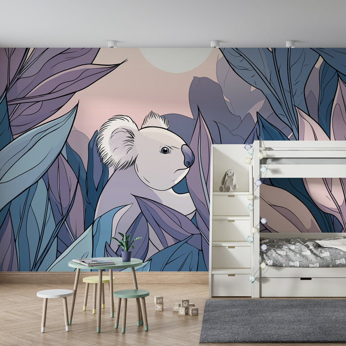 Les nuances délicates de bleu, de rose et de vert créent une palette apaisante, tandis que la silhouette du koala éveille la curiosité et l'intérêt pour la nature. Entre les feuillages artistiquement dessinés, ce motif apporte une touche de fantaisie et de tranquillité à l'environnement de votre enfant.