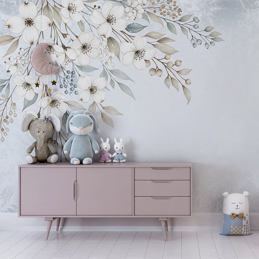 Afficher tous les détailsPapier peint chambre bébé | Fleurs délicates sur fond hivernal apaisant