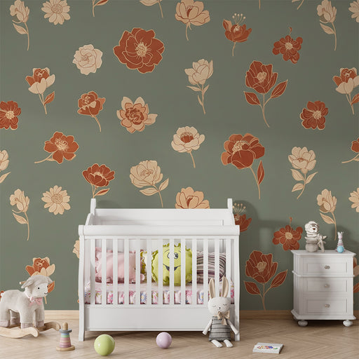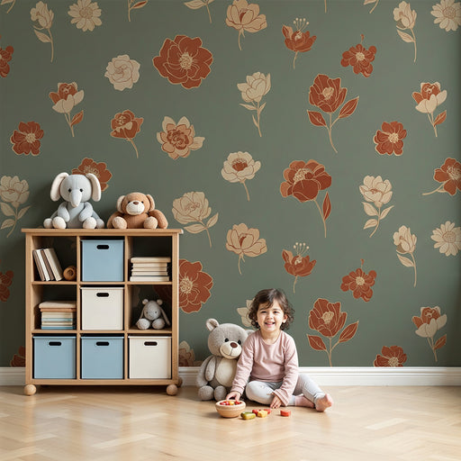 Papier peint chambre bébé | Fleurs stylisées en rouge et vert pastel