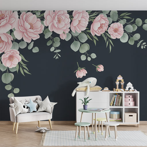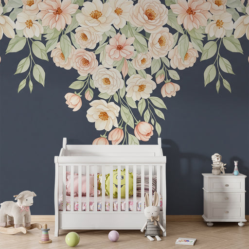 Afficher tous les détailsPapier peint chambre bébé | Fleurs roses suspendues sur fond sombre