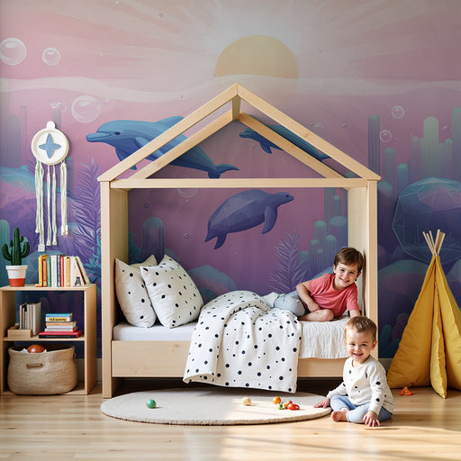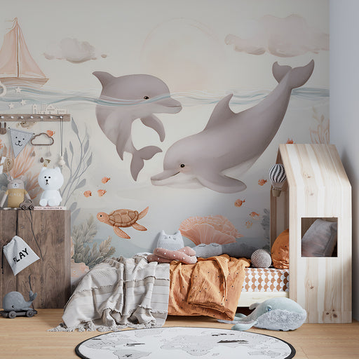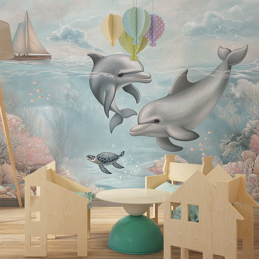 KidsWallPlongez dans un monde aquatique magique avec ce papier peint pour enfants, représentant un dauphin espiègle et une tortue amicale évoluant paisible...