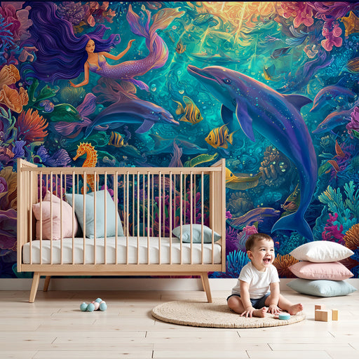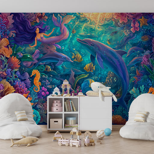 KidsWallCe papier peint sirène enchanteur capture une scène sous-marine magique où une petite sirène joyeuse joue avec un dauphin amical. Les couleurs vive...