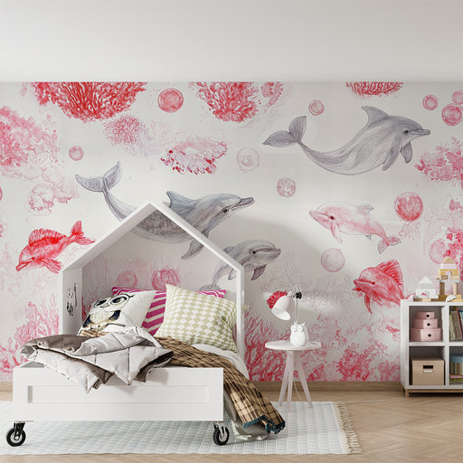 KidsWallPlongez dans un monde aquatique fascinant avec ce papier peint pour enfants, représentant des dauphins joyeux évoluant au milieu de poissons rouges...