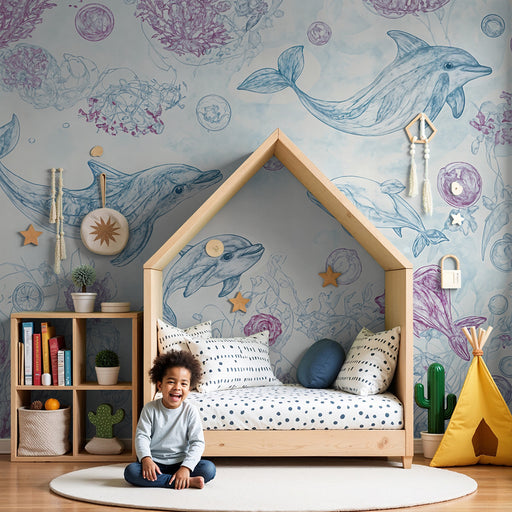 KidsWallTransformez la chambre de votre enfant en un véritable oasis aquatique avec ce papier peint pour enfants illustrant des dauphins joueurs dans un mo...