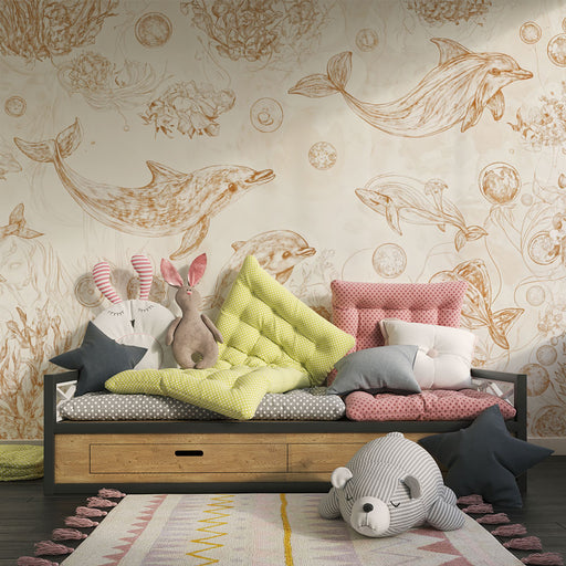 KidsWallOffrez à la chambre de votre enfant une ambiance marine enchantée avec ce papier peint pour chambre d'enfant illustré de dauphins joyeux et de bull...