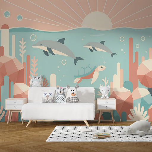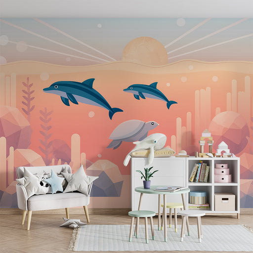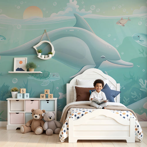 KidsWallEmbarquez pour une aventure ludique dans la chambre de votre enfant avec ce papier peint mural mettant en scène un dauphin joyeux et une tortue esp...