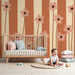 Les rayures dans des tons de terracotta et de beige ajoutent une dimension moderne tout en conservant une atmosphère apaisante. Ce design ludique et élégant stimule l'imagination tout en offrant un cadre serein pour le sommeil et le jeu.