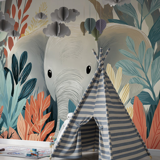 KidsWallEmbarquez votre bébé dans une aventure magique avec ce papier peint pour bébé mettant en scène un adorable éléphant émergeant d'une forêt riche en ...
