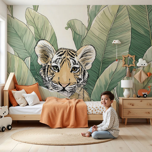 KidsWallRedécorez la chambre de votre enfant sauvage avec ce papier peint pour enfants, où un adorable petit tigre émerveille au milieu de grands feuillage...