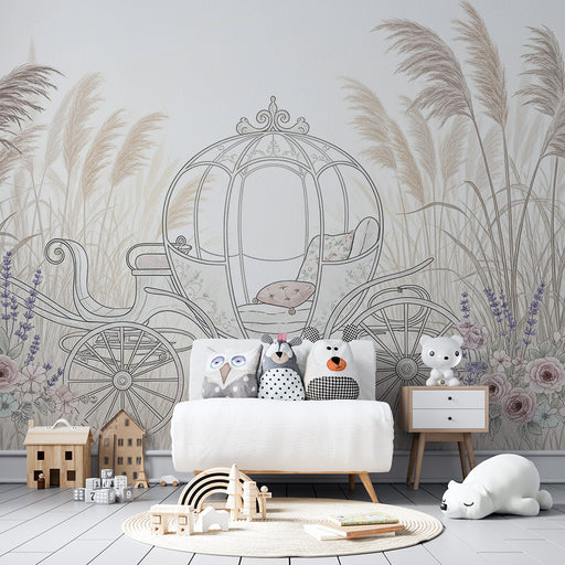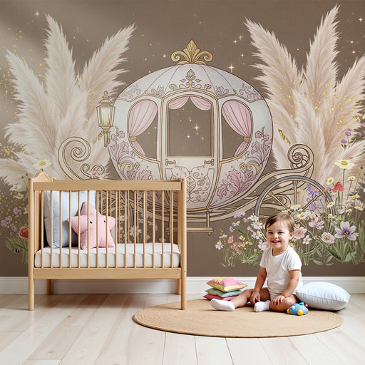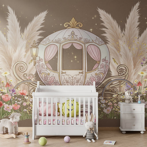 Afficher tous les détailsPapier peint chambre bébé | Carrosse féerique entouré de fleurs et de pampas