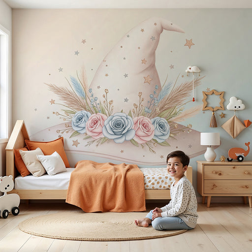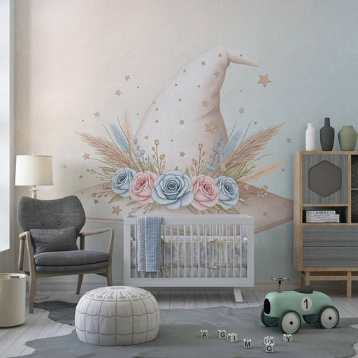 Afficher tous les détailsPapier peint chambre bébé | Chapeau de sorcière orné de fleurs et d'étoiles