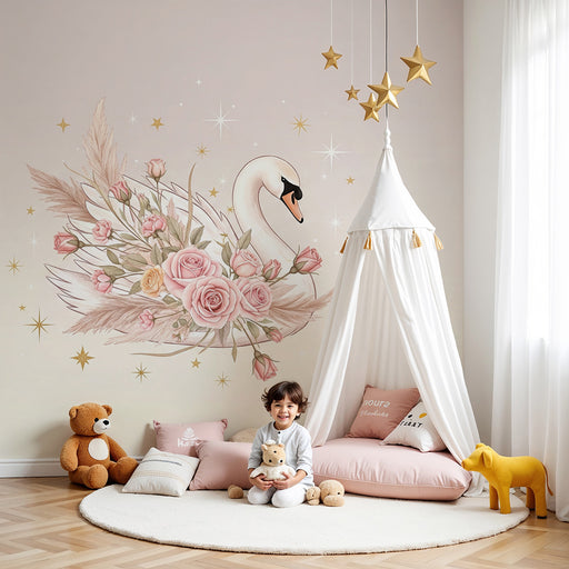 KidsWallTransformez la chambre de votre bébé en un véritable conte de fées avec ce papier peint pour bébé délicat. Un cygne majestueux, orné de fleurs rose...