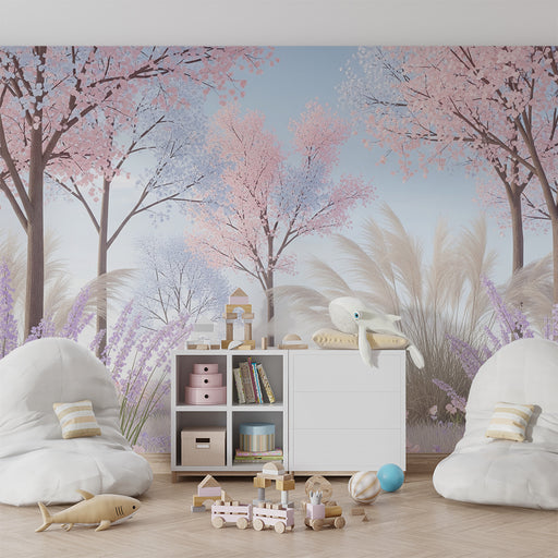 Afficher tous les détailsPapier peint chambre bébé | Forêt enchantée avec arbres fleuris et fleurs pastel