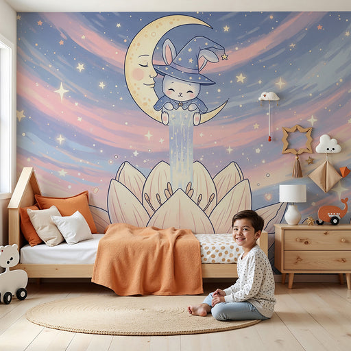 Afficher tous les détailsPapier peint chambre bébé | Lapin magicien sur une fleur de lotus sous un ciel étoilé