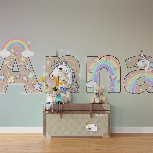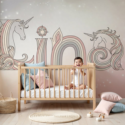 KidsWallAjoutez une touche de magie à la chambre de votre bébé avec ce papier peint pour bébé mettant en scène des lettres colorées ornées de licornes et d...