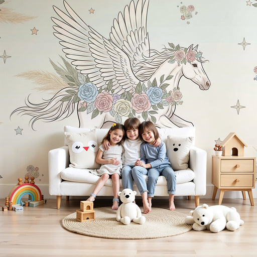 KidsWallTransformez la chambre de votre bébé en un univers féerique avec ce papier peint pour bébé représentant une magnifique licorne ailée. Évoquant la m...