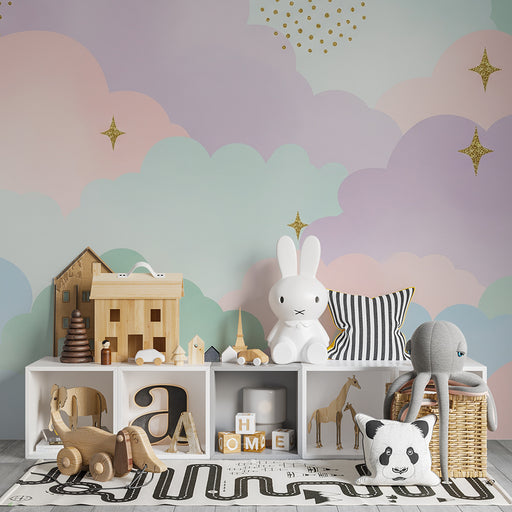 KidsWallOffrez à votre enfant un univers magique avec notre papier peint enchanteur, où une licorne aux crins arc-en-ciel danse gracieusement dans un ciel ...
