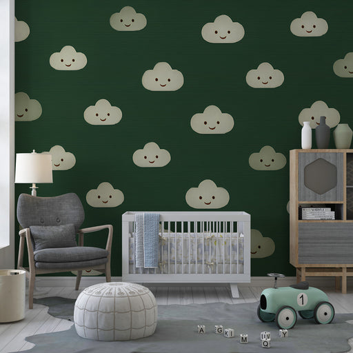 Papier peint chambre enfant | Nuages souriants sur fond vert