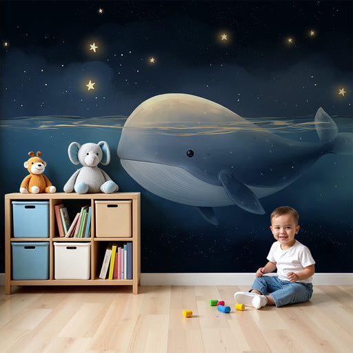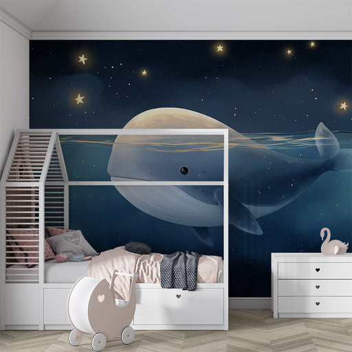 KidsWallPlongez dans un univers magique avec ce papier peint pour bébé représentant une majestueuse baleine nageant paisiblement sous un ciel étoilé. Les n...