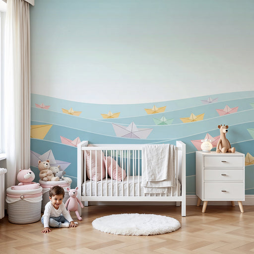 KidsWallTransformez la chambre de votre bébé en un univers marin enchanteur avec ce papier peint pour bébé illustrant des bateaux en papier flottant sur de...