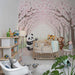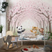 Les arbres majestueux, ornés de fleurs roses délicates, apportent une touche de douceur et de sérénité à la pièce. Les animaux, avec leurs expressions joyeuses, encouragent l'esprit de camaraderie et de jeu, rendant cet univers encore plus accueillant. Les nuances pastel et les détails charmants créent une atmosphère chaleureuse et apaisante.