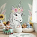 Les couleurs pastel et les détails raffinés apportent une touche de douceur, tandis que le fond vert subtil évoque la sérénité. Chaque élément, des fleurs aux traits de la licorne, est soigneusement conçu pour stimuler l'imagination et le rêve des tout-petits.