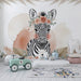 Les teintes pastel de rose et de beige, associées à des éléments floraux et feuillus, créent une atmosphère apaisante et chaleureuse. Le zèbre, avec son regard doux et ses rayures emblématiques, devient le compagnon idéal pour les rêves de votre enfant. Chaque détail est soigneusement illustré pour offrir une ambiance harmonieuse et accueillante.